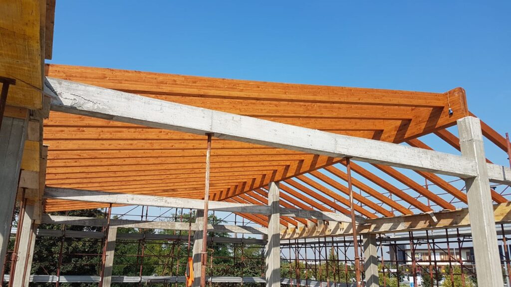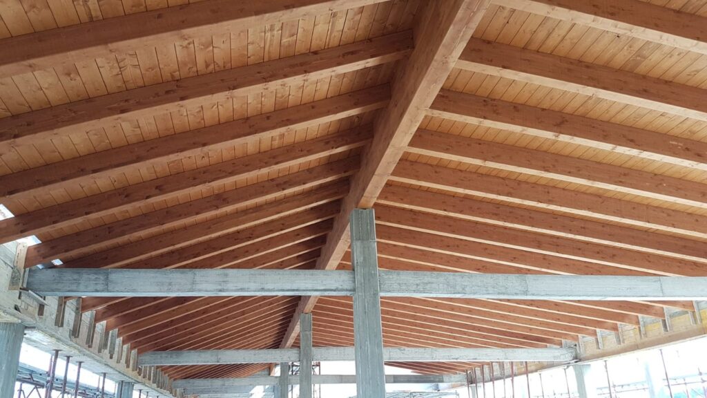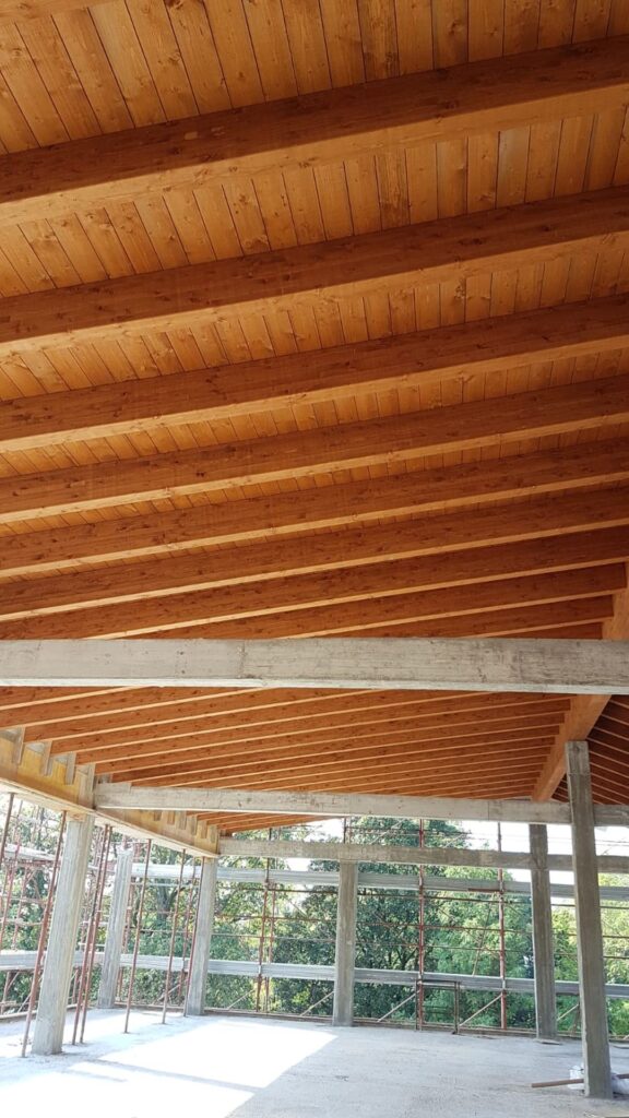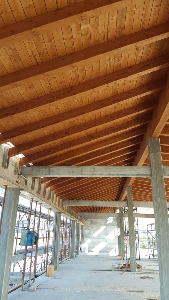 CGM srl si è occupata della progettazione della struttura in legno e della successiva realizzazione e messa in opera. La struttura della copertura in legno lamellare caratterizza anche dall’interno l’edificio; in particolare nelle aree comuni ove la struttura del tetto è a vista.